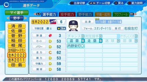 昨日に続いて、今回は2022版の生木盛生です。 2011の時と比べてミート、パワー、走力がそれぞれ-5、肩力と守備力が-1下がり、積極走塁が消えるなど完全に弱体化。 11年振りにメインキャラになれたのに可哀相。
