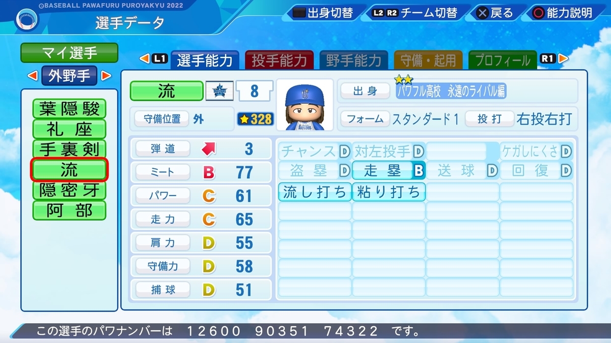 2022-05-18 パワプロ2022作成 サクセス 流(外野手) 2022作成選手 再現選手(サクセス) 再現選手(外野手) パワプロ2011 パワプロ2011に登場した得々農業高校の流(ながれ)です。 得々農業高校の固有モブは全て特殊能力から名前が取られています。 彼は「流し打ち」が由来です。