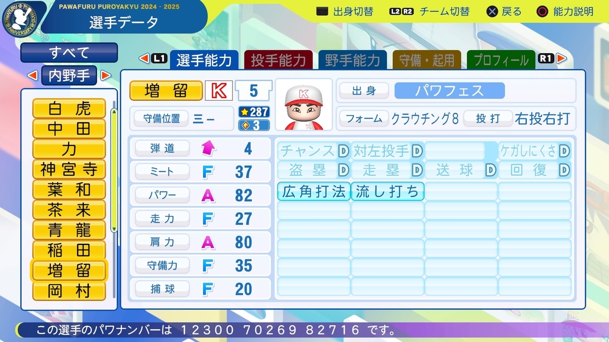 2024-09-04 パワプロ2024作成 サクセス 増留(内野手) 2024作成選手 再現選手(サクセス) 再現選手(内野手) パワプロ2011 パワプロ2011のサクセスに登場した大京近工業高校の増留(まする)です。固有モブなのでセリフなどはありません。 ファーストも守れるサード。 名前の由来はマッスルだと思います。 パワナンバー 12300 70269 82716