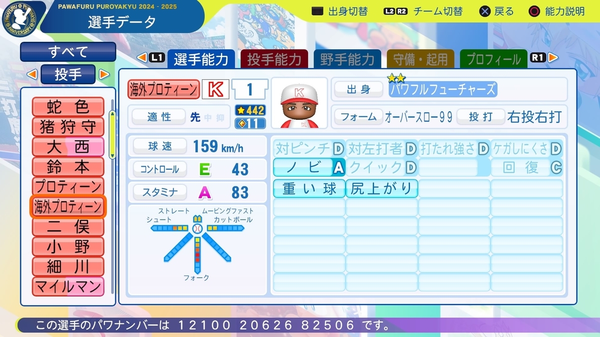 2024-12-24 パワプロ2024作成 サクセス プロティーン(投手)*海外登録版 2024作成選手 再現選手(サクセス) 再現選手(投手) 再現選手(外国人) パワプロ2012 パワプロ2012に登場したUSワールド大学のプロティーンの海外登録版です。 本来、日本の高校や大学を卒業してNPBのドラフトにかかれば日本人登録になります。 なのでこのプロティーンもUSワールド大学と言う名前ではあるものの日本の大学に通っているので、国内登録が普通なのですが、外国人枠で使いたいと言う人用に作ってみました。 パワナンバー 12100 20626 82506